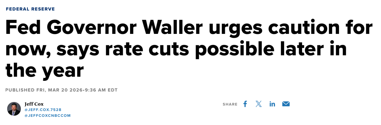 Waller称,近期劳动力市场变化与地缘冲突带来的不确定性,使得货币政策需采取更为保守的策略。他强调,暂停降息并非全年维持利率不变,若经济形势平稳、劳动力市场持续疲软,他将在年内后续会议上呼吁下调政策利率。2月美国非农就业人数减少9.2万人,若后续就业数据持续走弱,将被视为劳动力市场的重要信号。